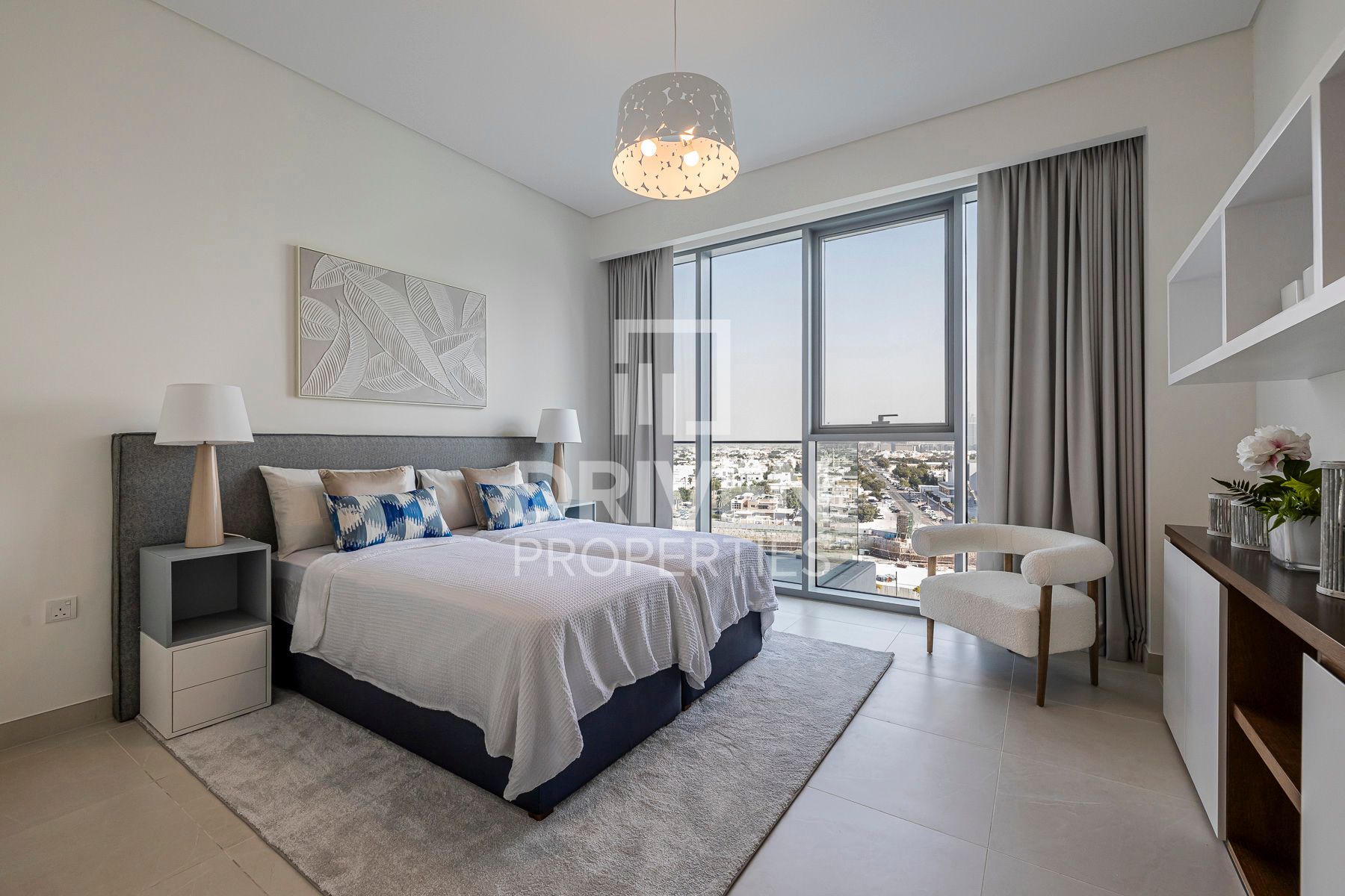 • Bedrooms: The headboards, bed bases, and upholstery are by L’Anees Furniture and Decoration, ensuring comfort and superior quality. The master bedroom features a silver glass hanging pebble light by English designer Tom Dixon.