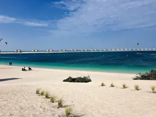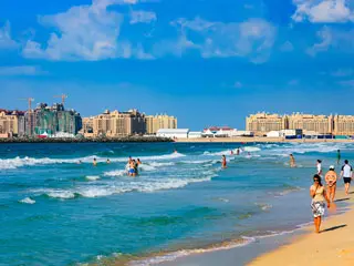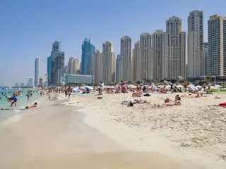 Jumeirah Beach Residence is the most extensive beach in Dubai and one of the top beaches in Dubai. It extends the entire length of the JBR area. The beach offers plenty of facilities, restaurants, and shops for ice cream and snacks. The sand is soft white and powdery, and the water is warm and beautiful blue-green. There are lifeguards on duty, and swimming areas are roped off with buoys.