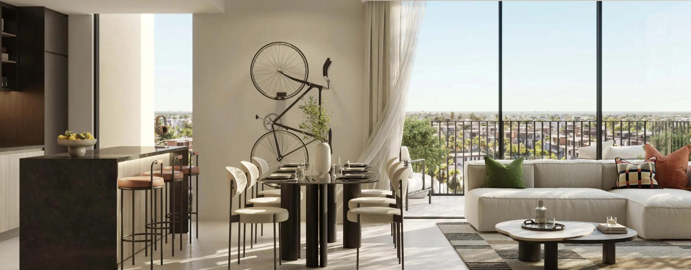 Rise by Athlon from Aldar Properties introduces a forward-thinking collection of 1, 2, and 3-bedroom apartments in Dubailand, where futuristic design meets energetic urban living. Its bold architecture features sleek glass, warm metallic accents, and dynamic cantilevered forms that express motion and modern ambition. Inside, expansive layouts are illuminated by natural light and finished with refined materials such as natural stone, matte cabinetry, and soft textiles in elegant neutral tones.