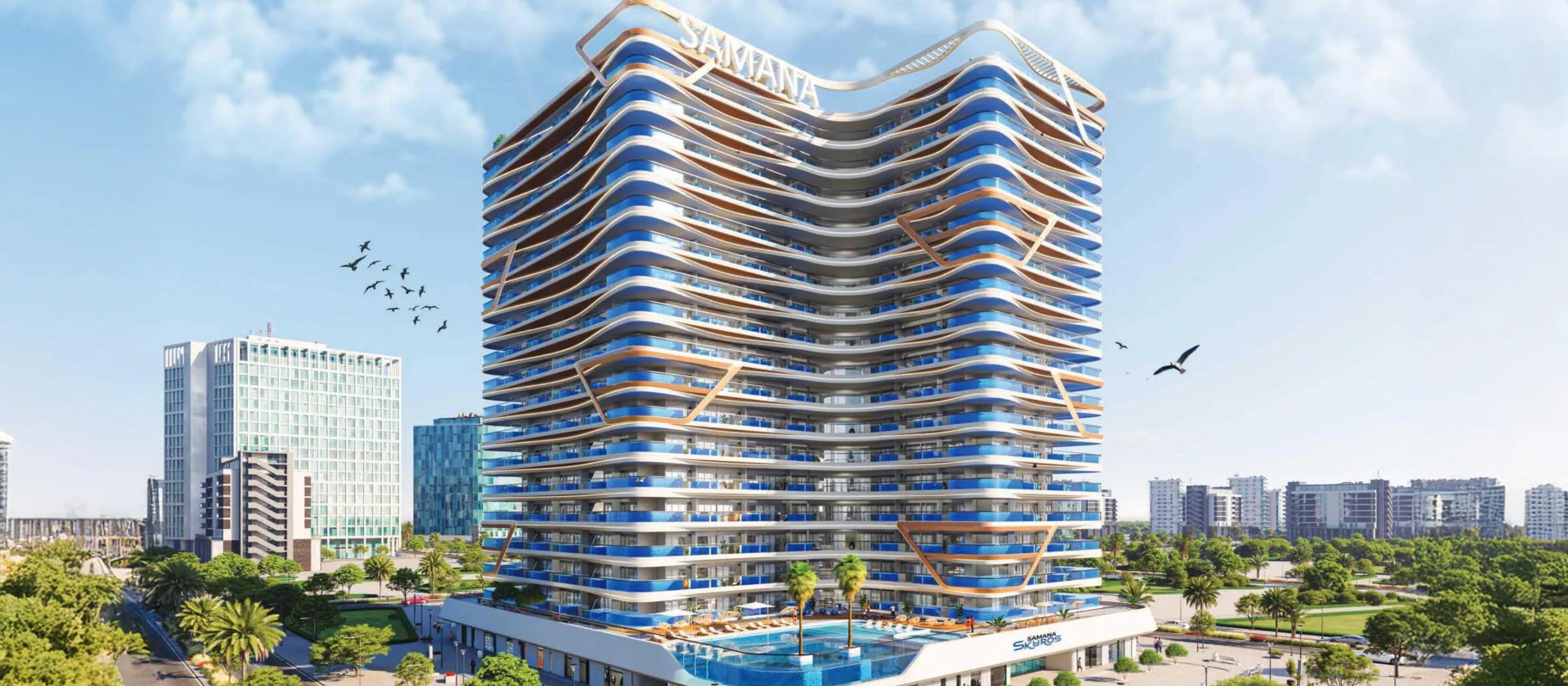 Samana Skyros by Samana Developers is a 17-storey architectural masterpiece in Arjan, Dubailand, offering luxurious studios, 1 and 2-bedroom apartments mostly with private pools. Inspired by elegant Greek design, this modern residence blends innovation, comfort, and style across 441 thoughtfully crafted units. Nestled minutes from Sheikh Zayed Road, residents enjoy seamless access to Dubai’s major landmarks.